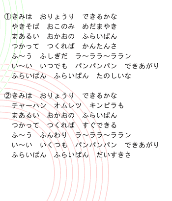 そして、料理を楽しく作り、家族そろって食べると、とっても楽しくて、おいしいと歌い上げています。